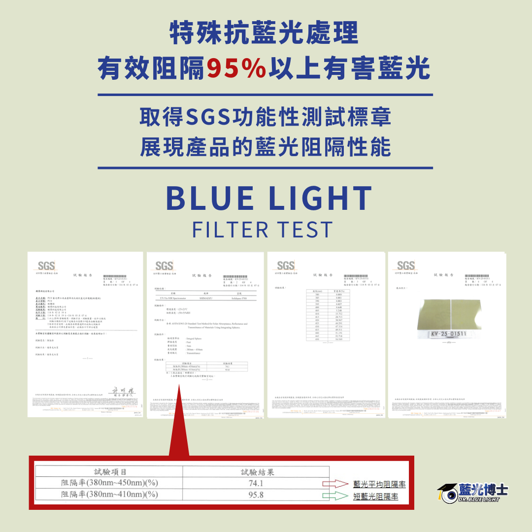 抗藍光功能:經SGS檢測認證,特殊抗藍光處理有效阻隔95.8%有害藍光。